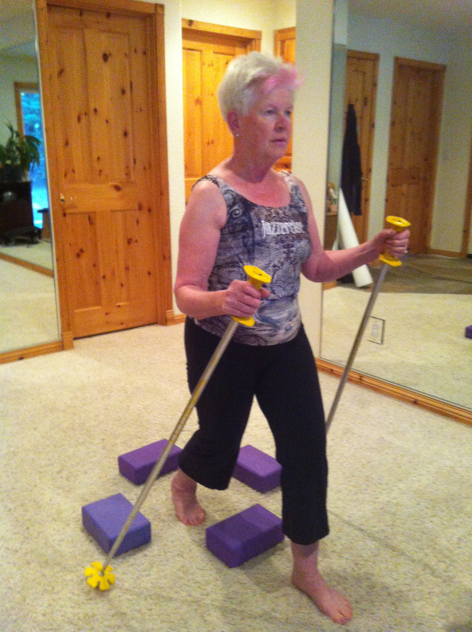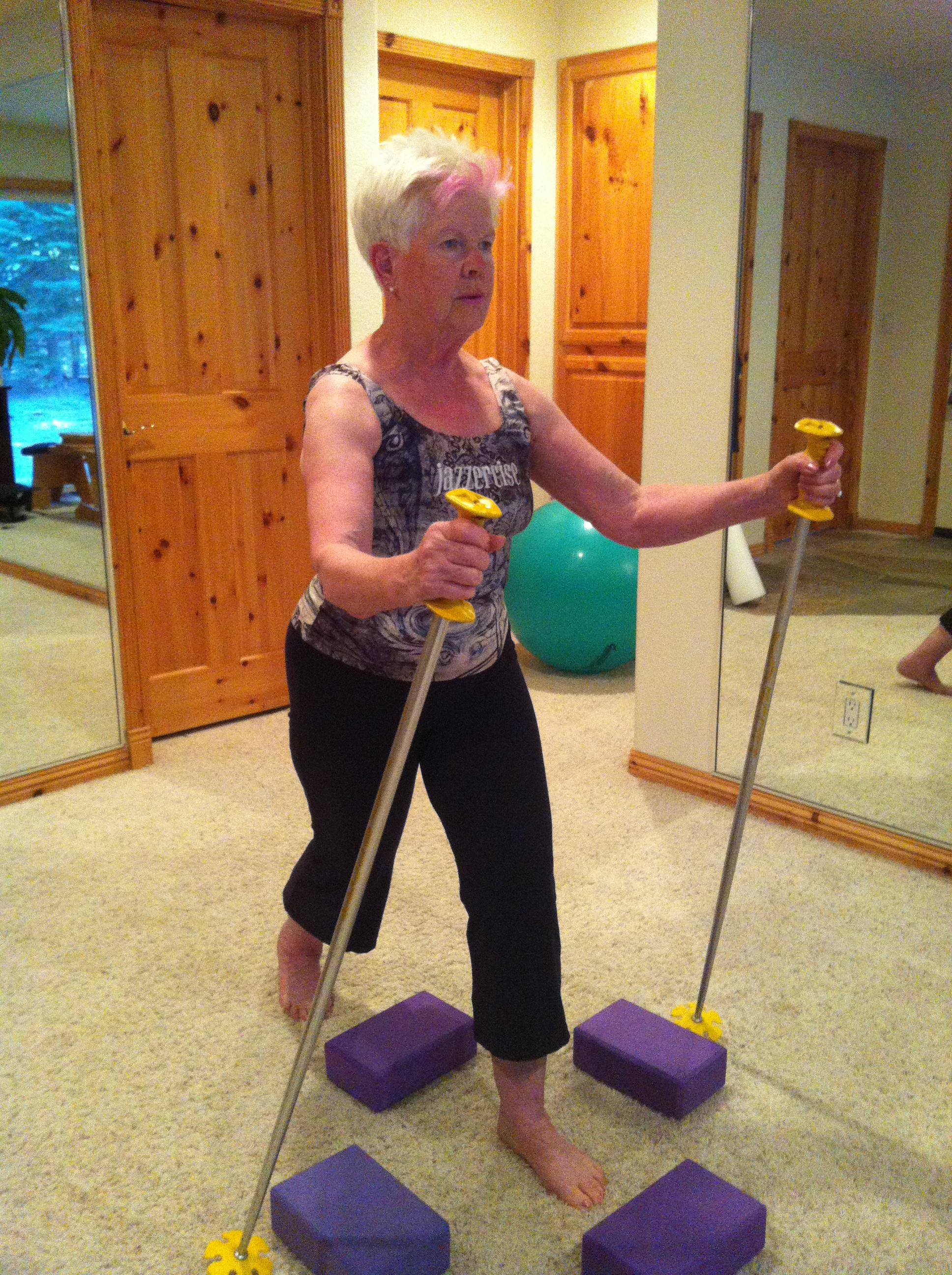 Firmly hold the hands and wrists of your client for additional support or let your client use hiking or ski poles. Once confidence and skill improves, the exercises can be done without assistance.![IMG_1604[1]](https://pilatesteachertips.com/wp-content/uploads/2013/10/img_16041.jpg?w=112&h=150)