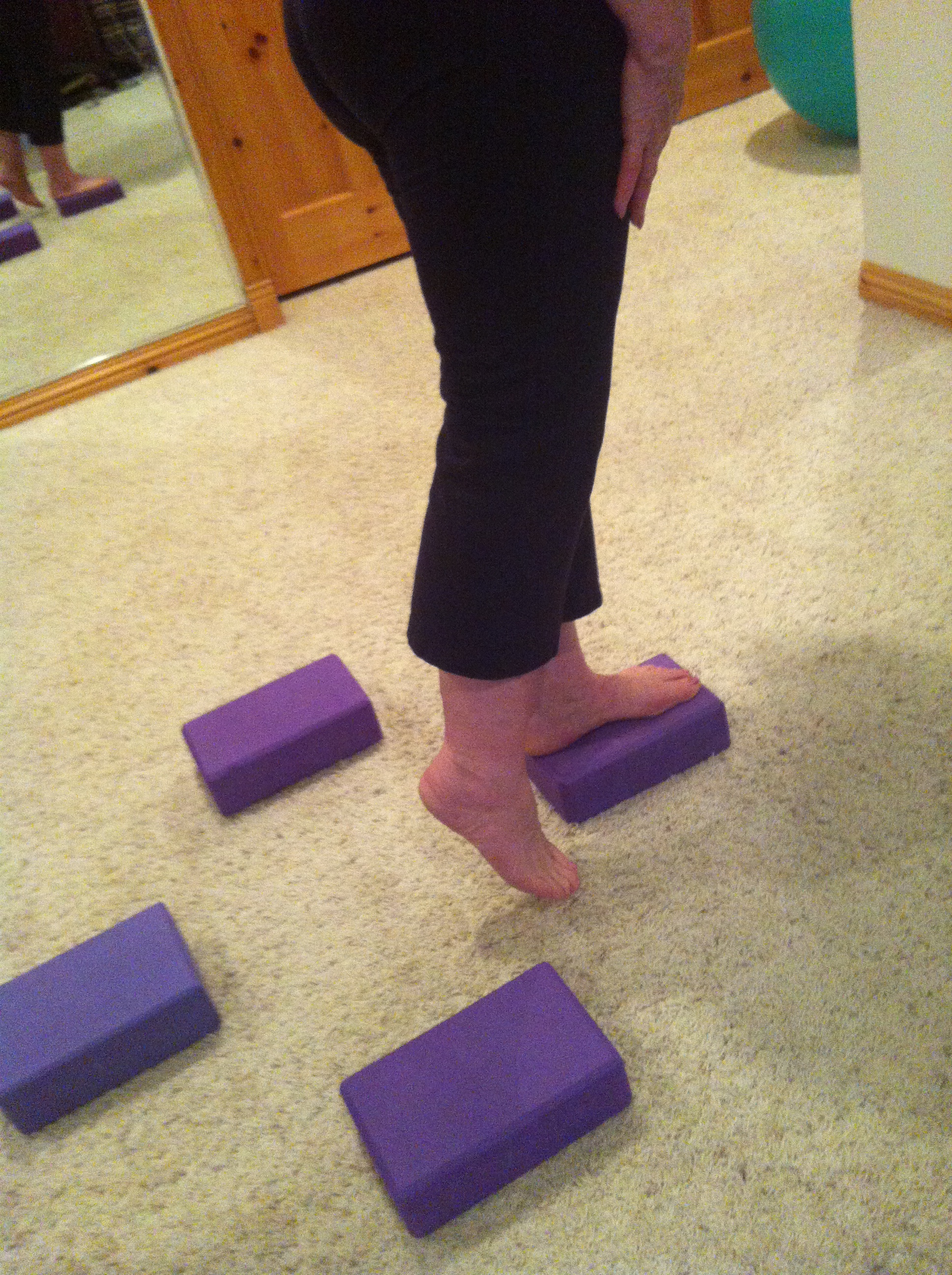 Although the yoga blocks are useful tools since they are a good height and size for practice, any obstacle is acceptable. Envelopes can work well as a target to step over if picking up the feet is too difficult. A client can practice at home stepping over books, shoes or even cracks on a sidewalk. If your client is unstable, assign a preparatory exercise to stand on one leg in a doorway holding the doorframe or holding onto a counter for stability. Make sure your client’s home practice is commensurate to skill.