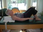 Although a full breath in the chest includes breathing into the front of the chest, this can hinder lumbar support when lying supine and holding the legs in the air. When people breathe anteriorly, they often lift the chest off the floor diminishing the supported counter-leverage necessary to hold the legs in the air. Have your client visualize squeezing a marble below the xiphoid process and hold it on the exhalation with the narrowing of the ribs. Suggest that your client take an inhalation without losing the marble. This requires the breath go to the back and to the side of the ribs in a saddle shape. The marble image keeps the thoracic vertebrae pressed into the floor maintaining the strength of the posterior pelvic tilt and support for the lumbar region.