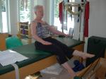 Next ask your client to rock from side to side feeling each sit bone (the carriage will be stationary). Have your client push off of the right sit bone to sit up taller moving the head toward the ceiling as if making space for the kidney and notice the activation of the right lumbar multifidus muscles. Raising the arms overhead can sometimes make the firing of the low back muscles easier feel. Repeat it to the left.