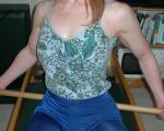 Note that some people use their facilitating respiratory muscles to do the job of the primary respiratory muscles causing the shoulders to lift and lower during each breath. To prevent this, have her imagine that an inner tube is around the chest and to breathe only in this area. You can wrap a scarf around the ribcage for better feedback. Direct her to pull air through her nose and take as many “sniffing” breaths as possible filling up this inner tube and notice the feeling of the muscles engaging in the chest. The last few sniffs will not yield more air intake, but will feel more like intercostal muscles around the ribcage firing. After performing this sniffing breath a few times, go back to normal breathing and she should feel that it is easier to expand the chest and fill up the inner tube.