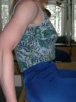 It may be difficult for your client to keep both sit bones weighted in the lateral ribcage shift. Suggest that the bones of the pelvis are like a boat weighted in the water. Keep the boat heavy while the muscles and flesh lift upward into the lateral shift much like the vertical mast. You may see a crossover from the previous exercise. For example, if you client felt more comfortable with the weight on the right sit bone moving front to back, he/she may tend to lift the left sit bone as the ribcage moves sideways to the right since it is not used to bearing weight.
